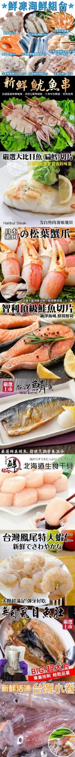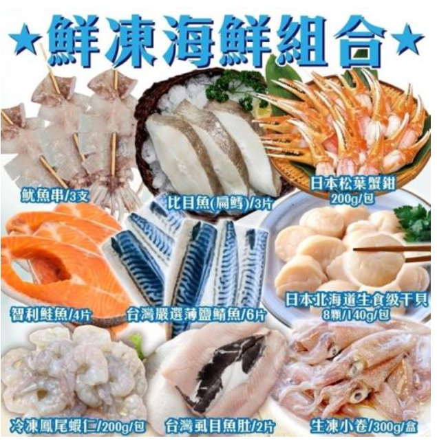 精選分類 分類介紹 高級貝蝦蟹類 19 products 解凍即食/蔬菜類 4 products 強檔特惠 10 products 嚴選海鮮 12 products 休閒零食 18 products 精選商品 精選商介紹 【卡迪那】95℃薯條-經典原味(18gx5入x12盒) 休閒零食 NT$750 商品特色 · 運用新一代「95℃低溫真空 加入購物車 Quick view 【日本】生食級干貝2S-1kg/盒 高級貝蝦蟹類 NT$4,000 五星級日料必出的珍貴食材 嫩又彈牙、甘甜 加入購物車 Quick view 【日本】生食級干貝2S-500g/盒 高級貝蝦蟹類 NT$2,300 五星級日料必出的珍貴食材 嫩又彈牙、甘甜 加入購物車 Quick view 【烤肉組合】全海鮮多多6件組 強檔特惠 NT$3,450 商品特色 給海鮮控的中秋夢幻大補帖!一次 加入購物車 Quick view 【烤肉組合】多人歡聚派對23件組 強檔特惠 NT$10,000 商品特色 今年中秋,要烤就烤得氣勢滿滿、 加入購物車 Quick view 【高級居酒屋愛用】阿根廷巨無霸魷魚一夜干*5入 嚴選海鮮 NT$1,800 商品特色 新鮮阿根廷魷魚專業處理 經過一 加入購物車 Quick view 10尾紅條魚/珊瑚石斑(350~450g±10%/尾) 高級貝蝦蟹類 NT$3,000 五朝港嚴選的紅條魚/珊瑚石斑,表層紅潤全 加入購物車 Quick view Anthon Berg 烈酒巧克力禮盒 1公斤 Anthon Berg Liquor-Filled Dark Chocolates 1 kg 休閒零食 NT$1,299 商品敍述 注意事項:此商品含微量酒精成分 加入購物車 Quick view 熱門商品 熱門商品說明 龍蝦烏魚子白鯧海鮮禮盒(1188g/1組)*2組 強檔特惠 NT$10,000 1.商品品名:【海之醇】龍蝦烏魚子白鯧海 加入購物車 Quick view 鱈場蟹天使紅蝦3入組合 高級貝蝦蟹類 NT$2,150 商品規格:【海之醇】秋之颯宴鱈魚場蟹天使 加入購物車 Quick view 鮮凍鯛魚片(300g/包)5包(約25片) 嚴選海鮮 NT$12,000 嚴選新鮮鯛魚,急速冷凍鎖鮮,貼心去刺處理 加入購物車 Quick view 鮮凍海鮮組合 強檔特惠 NT$4,800 台灣吳郭魚(已去鱗、去鰓、去內臟),肉質 加入購物車 Quick view 馬上招財餅乾鐵盒(6入)(1箱) 休閒零食 NT$4,480 商品特色 ●多款手工餅乾:內含洛神花茶餅 加入購物車 Quick view 頂級熟凍松葉蟹(375-420g/隻)2隻 高級貝蝦蟹類 NT$3,180 嚴選頂級松葉蟹,蟹肉鮮甜細緻、蟹香濃郁, 加入購物車 Quick view